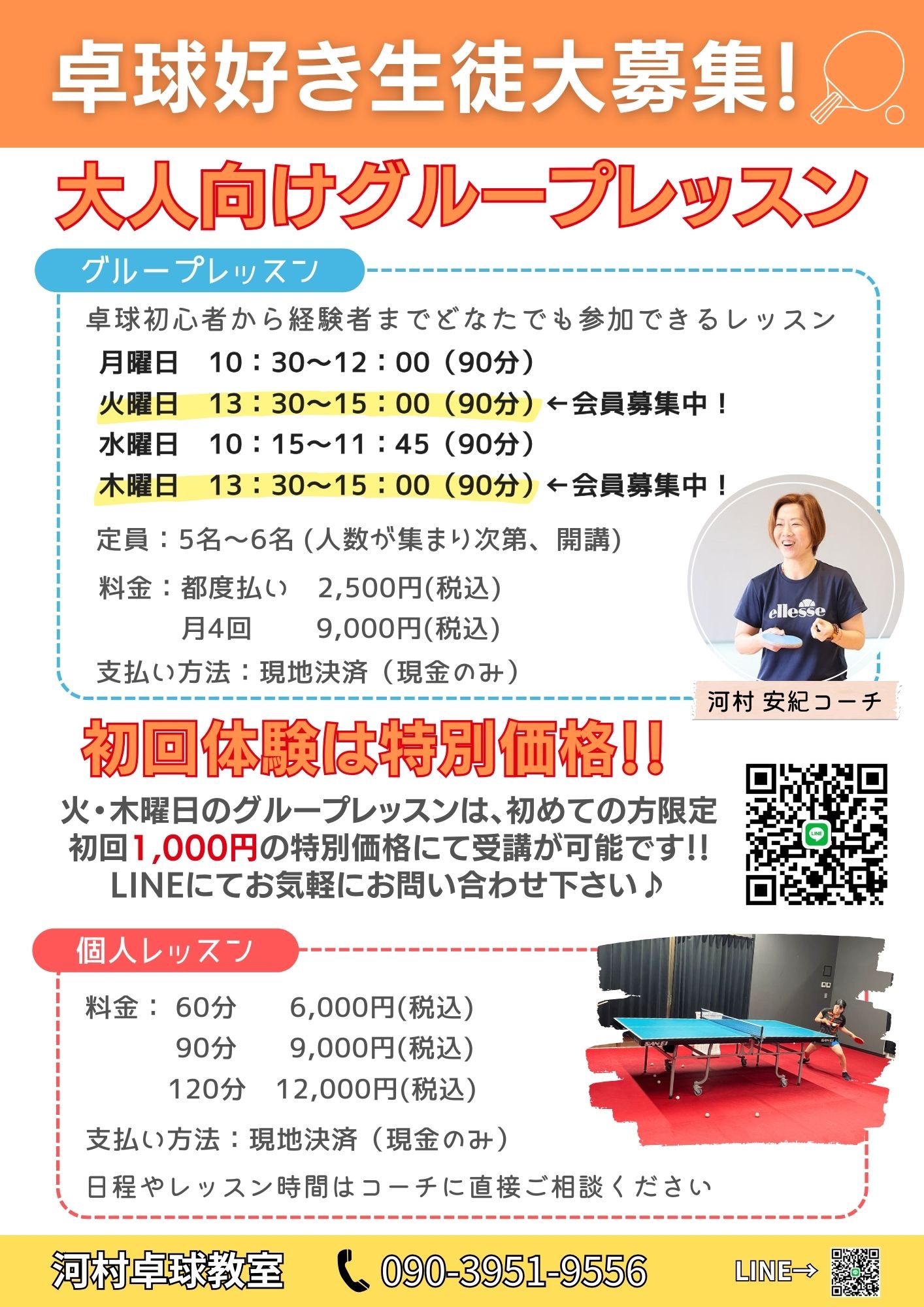 河村卓球教室では、新しく火・木曜日にグループレッスンを開講いたします!